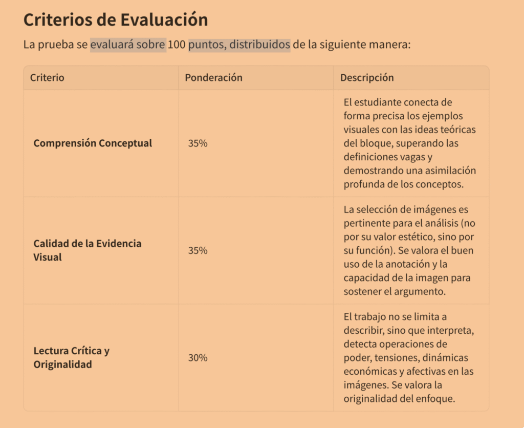 – La opinion / reflexion debe ser fundamentado por conceptos teoticos, evidencia visual y una lectura critica que los conecte.