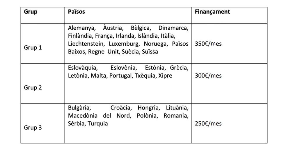 - La ayuda individual es la ayuda económica en concepto de gastos adicionales ocasionados por la participación en el programa ERASMUS+. Su importe está en función del país de destino de la movilidad según la tabla siguiente y por un período máximo de 4,5 meses (135 días). Este máximo no aplica a los estudiantes que pertenecen a alguno de los colectivos de estudiantes con menos oportunidades (ver punto 5 de esta Base XI), a los que se calculará el importe en función de la estancia real que en ningún caso será superior a un semestre: