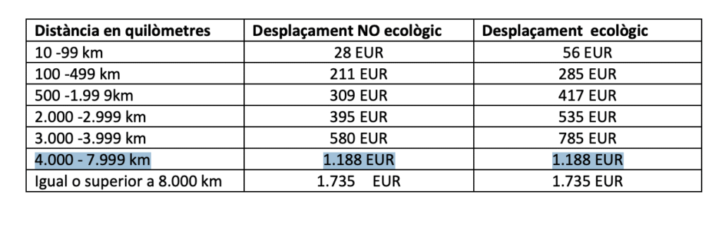 A partir del cálculo de la distancia, y según se trate de un desplazamiento ecológico o no, el importe de la ayuda de viaje se fija según unas franjas: