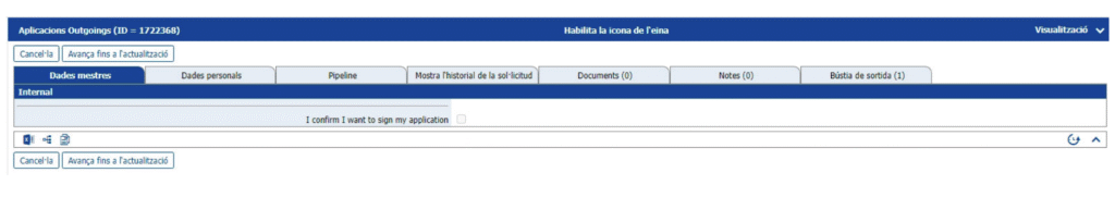 Para firmar la solicitud, debes clicar en el link que hay a la derecha de la imagen anterior e irás a una pantalla en la que habrá un checkbox que está desactivado. Para activarlo, debes clicar en el botón superior que pone “Avanza hasta la actualización”.