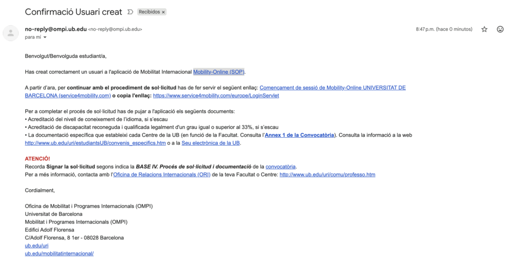 - Una vez firmada la solicitud, el estudiante recibe un correo electrónico con el número de asiento en el registro de la Universidad de Barcelona.