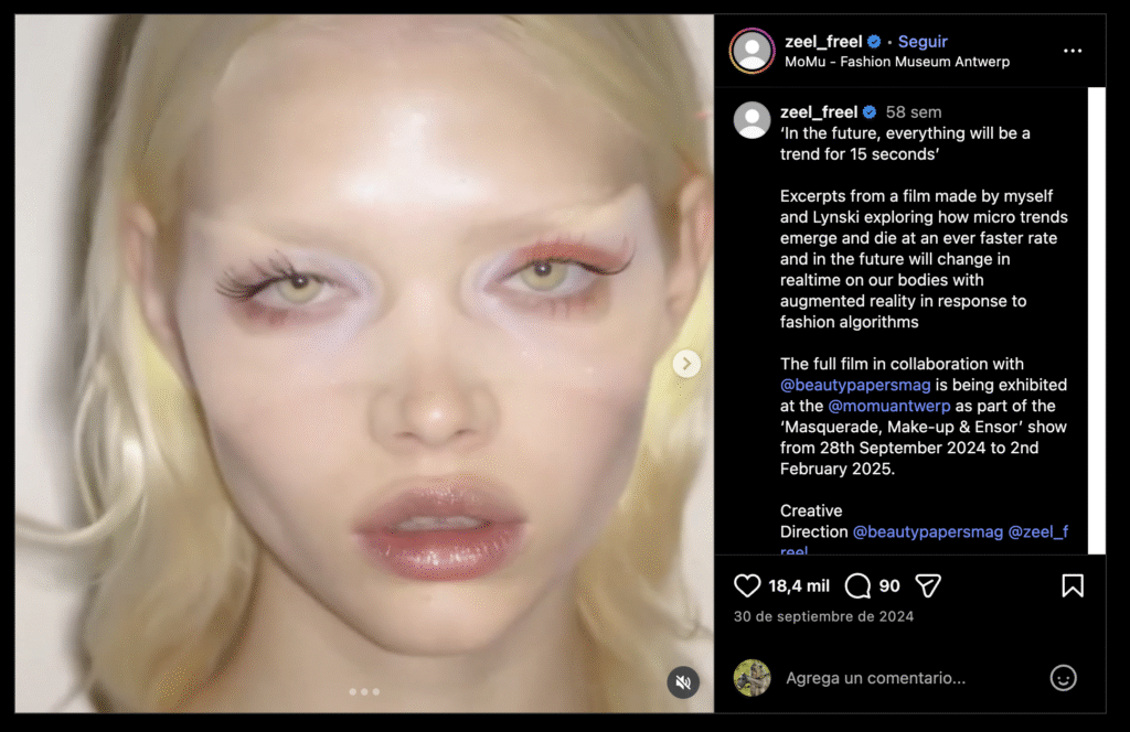 En «En el futuro, todo será tendencia durante 15 segundos», del artista visual Éamonn Freel (n. 1987) y la maquilladora Lynski (n. 1991), se explora la fugacidad de las tendencias de belleza digitales. Rostros etéreos con reflejos brillantes e intrincados elementos 3D se transforman rápidamente, creando una experiencia visual atractiva a la par que inquietante. La obra de vídeo refleja los ciclos acelerados de las tendencias en la era digital, cuya estética emerge y se desvanece en cuestión de semanas, impulsada por algoritmos [→P.7] y la constante necesidad de novedad de las comunidades globales en línea. En el centro de la obra reside la pertenencia performativa a través del material gráfico compartido. La cultura de la belleza digital se debate entre el deseo de ajustarse a los ideales globalizados y la necesidad simultánea de destacar mediante tendencias de nicho. Freel y Lynski imaginan un ciclo distópico donde los individuos adoptan y descartan tendencias sin cesar, representándolas en tiempo real mediante filtros de realidad aumentada (RA) [→P.7]. Su obra reflexiona sobre la difuminación de los límites entre identidad, representación y los sistemas capitalistas que perpetúan este ciclo.