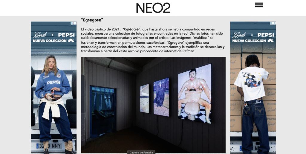 El tríptico de vídeo Egregore de Jon Rafman (n. 1981) explora las ansiedades y deseos colectivos de la web para revelar escenas perturbadoras de incomodidad surrealista y cotidiana. En las tradiciones esotéricas, un egregore representa una entidad espiritual compartida. Encarna la psique colectiva de un grupo y está moldeada por sus deseos, creencias y acciones. Rafman explora este concepto animando fotografías apropiadas de internet mediante herramientas digitales, haciendo referencia y expandiendo el mundo oculto de las llamadas «imágenes malditas». Estas imágenes sin autor muestran objetos comunes en contextos inquietantes, incluso impensables, o representan cuerpos humanos desplazados y enmascarados. Las perspectivas distorsionadas, los fallos digitales y los errores ópticos contribuyen a su efecto misterioso. Las «imágenes malditas» atraen y repelen simultáneamente, incitando al espectador a una búsqueda infructuosa de significado y contexto. Ya no son meros reflejos del inconsciente colectivo que Rafman evoca, sino que trascienden su condición representacional y se convierten en realidades en sí mismas.