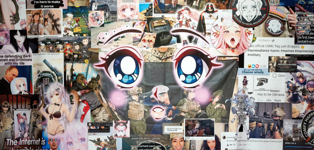 En Annihilation Core Inherited Lore ٩(͡๏̯͡๏)۶, Noura Tafeche (n. 1987) investiga cómo la estética de la ternura se instrumentaliza en línea para difundir propaganda militar y violencia. Basándose en cuatro años de investigación y un archivo de más de 30.000 archivos, Tafeche revela cómo los peluches de colores pastel, el fan art de manga y los ojos de cierva pueden convertirse en vehículos para mensajes bélicos, agresión sexualizada, fetichización de armas e ideologías de extrema derecha. Tafeche traza un mapa de las formas estéticas, desde el «kawaii» (un fenómeno cultural japonés que enfatiza la ternura y la inocencia) hasta los videojuegos, TikTok y el fan art, ilustrando cómo el contenido viral, como los memes o los retos de baile en línea, puede promover la misoginia, el supremacismo y el racismo. La instalación combina un entorno inmersivo con acceso interactivo al archivo de investigación de la artista, exponiendo cómo las formas aparentemente más inocentes de la cultura visual dominante pueden ser infiltradas por propaganda dañina.