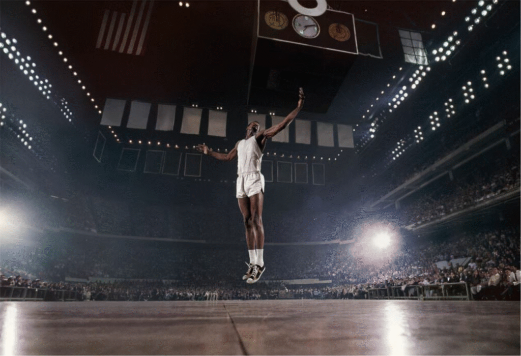 En ‘Los cuatro jinetes del apocalipsis’, Pfeiffer borra digitalmente las identidades de jugadores de baloncesto, convirtiéndolos en figuras anónimas que parecen mártires religiosos y que subrayan como el culto a los héroes del deporte se convierte en una devoción colectiva.