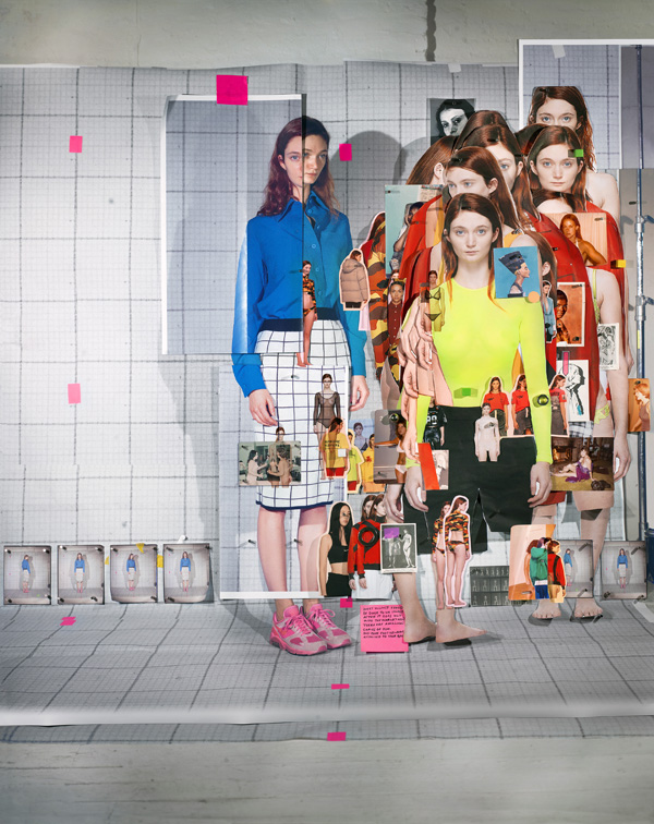expuesta en la sala contigua a Cover Girl , desentraña las reglas que estructuran las sesiones fotográficas de moda online. Una pelirroja menuda, de atractivo discreto, es fotografiada tres veces en el estudio de Cwynar sobre un fondo con un patrón de cuadrícula: en la primera imagen, de frente; en la siguiente, ligeramente inclinada hacia la izquierda; y en la tercera, de espaldas al espectador. La modelo, Sophie, es una popular modelo web, y la configuración en tres partes refleja la forma en que se suele fotografiar a las modelos para la venta de ropa online, con un giro de tres puntos que muestra la parte delantera, lateral y trasera de la prenda. Cwynar ha hecho visible este detalle superponiendo, sobre los retratos de estudio a gran escala, capas de fotografías más pequeñas de Sophie en posiciones idénticas, impresas de páginas web (principalmente de Ssense, una plataforma de moda, editorial y comercio electrónico de alta gama) y recortadas. Luego, Cwynar volvió a fotografiar el conjunto, otorgando a la composición final un aire de profesionalismo y amateurismo a la vez: los trozos de cinta adhesiva visibles, los cortes de tijera imperfectos y ligeramente irregulares, y la calidad artesanal y cariñosa del arreglo —como la que se podría ver en un tablero de inspiración o en la puerta de un casillero— contrastan con el brillo plano de su formato.
